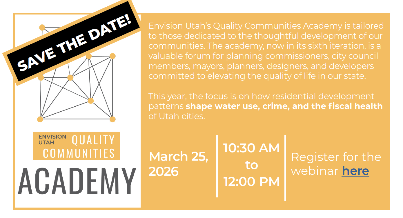 Envision Utah's Quality Communities Academy is tailored to those dedicated to the thoughtful development of our communities. The academy, now in its sEventh iteration, is a valuable forum for planning commissioners, city council members, mayors, planners, designers, and developers committed to elevating the quality of life in our state.